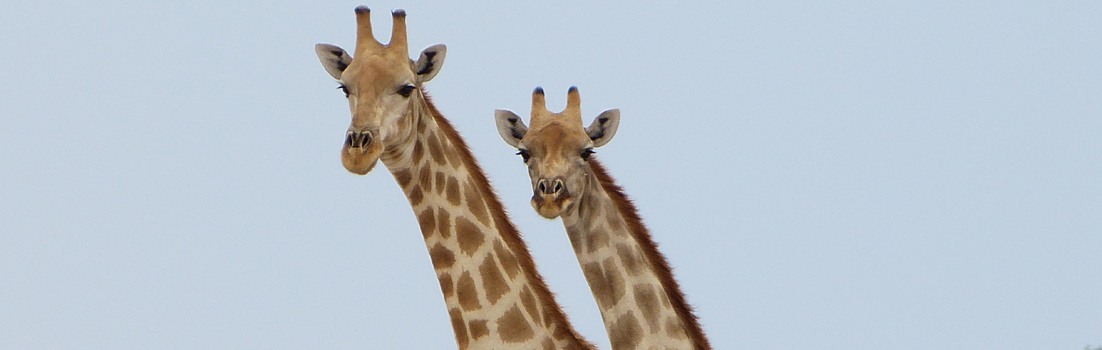 Etwas heruntergekühlt machen wir uns auf den Weg zurück in die Lodge. Da ragt doch schon wieder ein Kopf hinter den Bäumen hervor. Die Mamagiraffe mit ihrem Baby. Herrgott, ist das putzig!