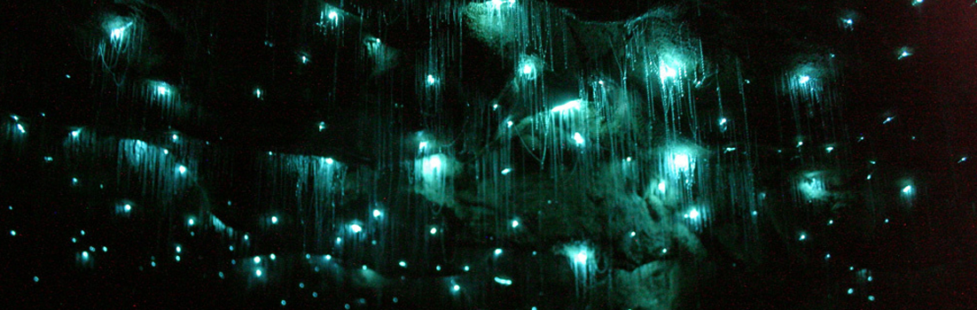 Durch kathedralenartige Höhlen geht es, vorbei an einem 2000 Jahre alten Urvogelskelett, immer tiefer ins Höhlensystem. Irgendwann heißt es dann, Stirnlampen aus und Augen an die Dunkelheit gewöhnen… und da sind sie! Zigtausende kleiner türkiser Punkte (danke an Spellbound, dass die Bilder genutzt werden dürfen, denn meine sind bei weitem nicht so schön).