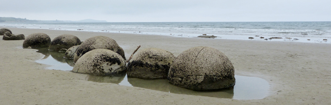 Weiter geht es zu den Moeraki Boulders. Runde, hohle Steine am Strand. Hier steppt wieder mal der Bär, aber wir sind fasziniert, was die Natur so für Dinge erschafft und amüsieren uns, wie alle anderen auch, auf und neben den Steinen.